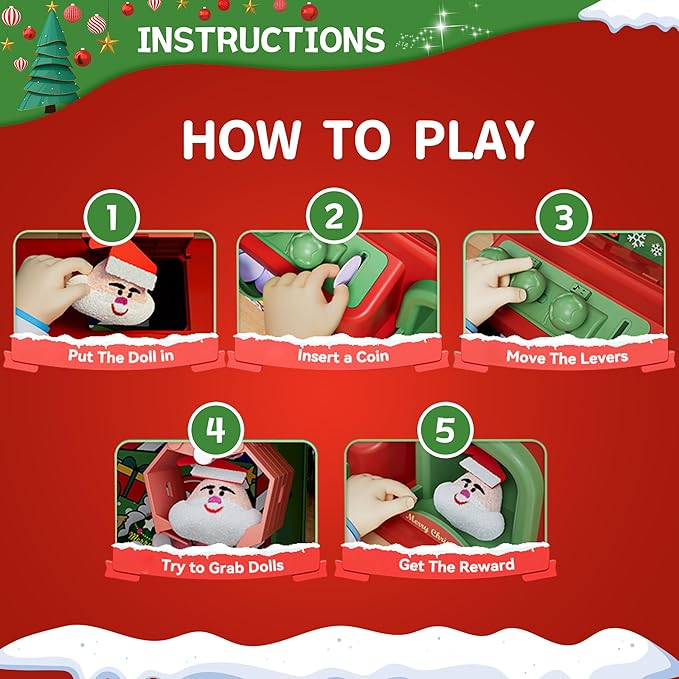 - 【Special Holiday Gift for Kids】Designed for festive fun, this claw machine is perfect for Easter gifts for kids 3-5 and Christmas surprises. Featuring adorable themed dolls and decorations, it adds excitement to Easter basket stuffers for toddlers 1-3 and holiday parties. A great addition to Easter games for kids, it’s ideal for family gatherings or as a unique Easter gift that brings joy to every celebration!