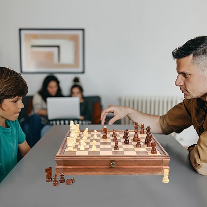 REEIVER 15" Wooden Chess Sets with Built-in Storage Drawer, 2 in 1 Chess& Checkers Board Games for Adults and Kids