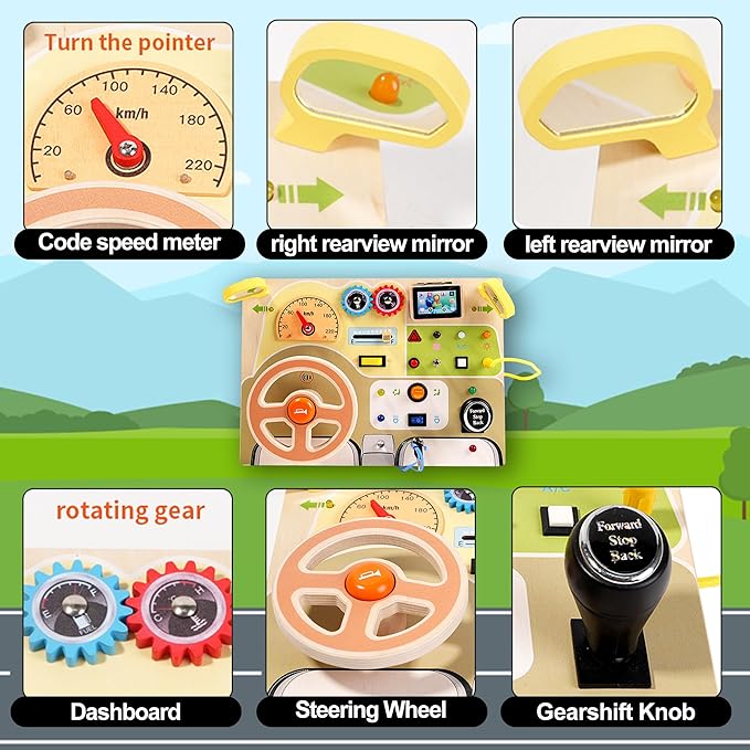 - Car Steering Wheel Design: This Montessori busy board is designed to mimic a car's dashboard, which helps babies or kids develop fine motor skills, practice hand-eye coordination, color discrimination, and develop intelligence. This sensory toy is well constructed and all the push buttons are the perfect size for toddlers to press with ease,baby busy board needs 2 AAA Batteries (Not Included)