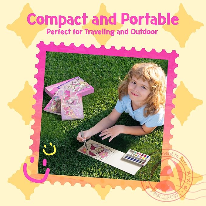 - All-in-one Watercolor Set:Packed with 3 unicorn coloring books, 3 brushes, 12 bright paints, and a mini palette, this set keeps everything kids need in one box. The books are easy to hold, so they can dive into painting right away, making it a fun travel coloring kit for kids.
