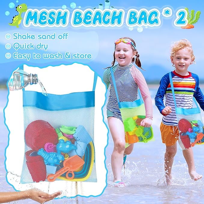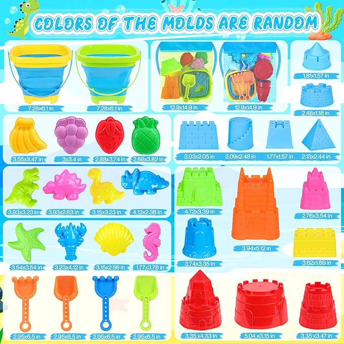 - Double Buckets Packable Beach Sand Toys Set --- Super value 32 PCS kids sand toys for the beach travel and sand box. Includes foldable beach bucket *2, mesh beach bag *2, big sand castle mold *8, small sand castle mold *6, sea animal mold *4, dinosaur mold *4, fruit mold *4, sand shovel *2, sand rake *2. These travel beach toys is for kids toddlers babies age 3 4 5 6 7 8 9 10 11 12. Must have beach essentials for kids toddlers family. Beach games for kids 3-10