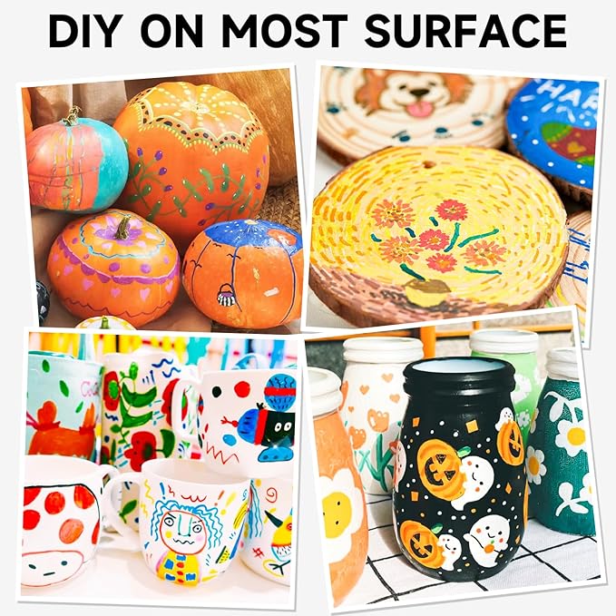 - 【MULTI-PURPOSE】: Enjoy creating art projects on a variety of surfaces, acrylic paint marker set suitable for rock painting, ceramic and mug painting, glass and wine glass painting, wood, fabric, stone, metal, plastic, canvas, Christmas ornament, Halloween pumpkin painting, calligraphy, scrapbook, bullet journal, brush lettering, custom mugs, DIY crafts projects, and much more for both smooth and porous surfaces.