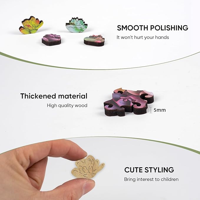 - Succulent Wood Puzzle: Each puzzle piece is cutting art, the different irregulars wooden puzzle shape make your puzzling time more enjoyable.It will take 4 hours to finished, a great time to work with your or partner