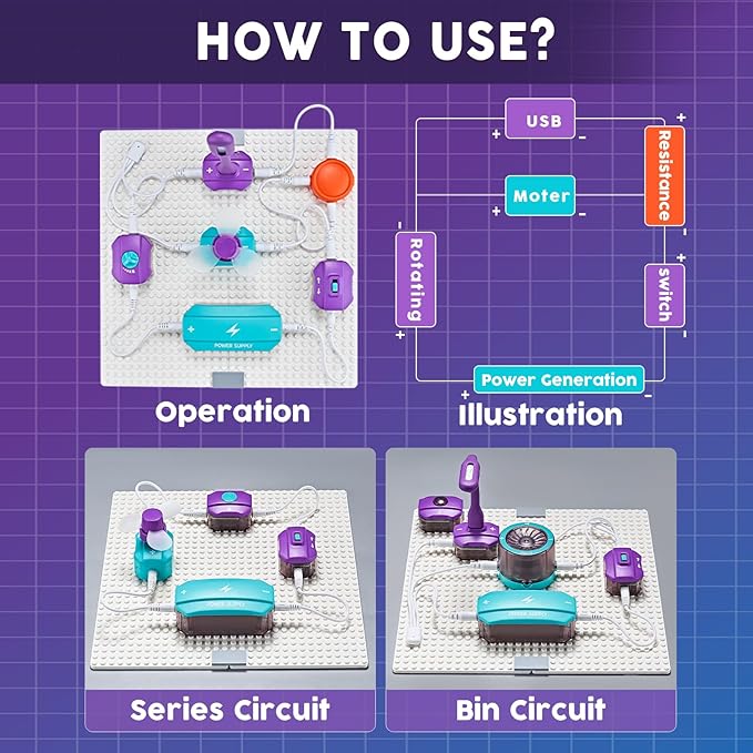 - SAFE DESIGN & DETAILED INSTRUCTIONS - These electronics kits feature non-toxic plastic parts with rounded corners and a low-voltage DC power supply to ensure child safety during use. The package includes detailed instructions or manuals that not only show how to build preset circuit models, but also explain the working principles of each circuit, covering basic concepts such as current, voltage, resistance, series and parallel circuits.