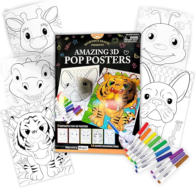 - DYNAMIC 3D ART PROJECT: Immerse your child in a captivating creative experience with Marvin’s Magic 3D Pop Posters! This kit features 5 mesmerizing animal designs that jump right off the page after coloring, offering a dynamic twist to traditional coloring activities. It's more than just a craft; it's an interactive adventure in art that will excite both kids and parents. Perfect for at-home entertainment or on-the-go fun, these posters are sure to spark imagination and artistic joy.