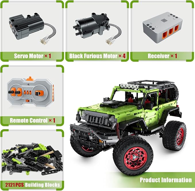 - [Build and Drive] Paired with 4 powerful black furious motors, this jeep kit is designed to perform excellently on hill climbing and off-road driving. With rotational speeds three times that of conventional motors, you can be sure that this jeep is up for any challenge.