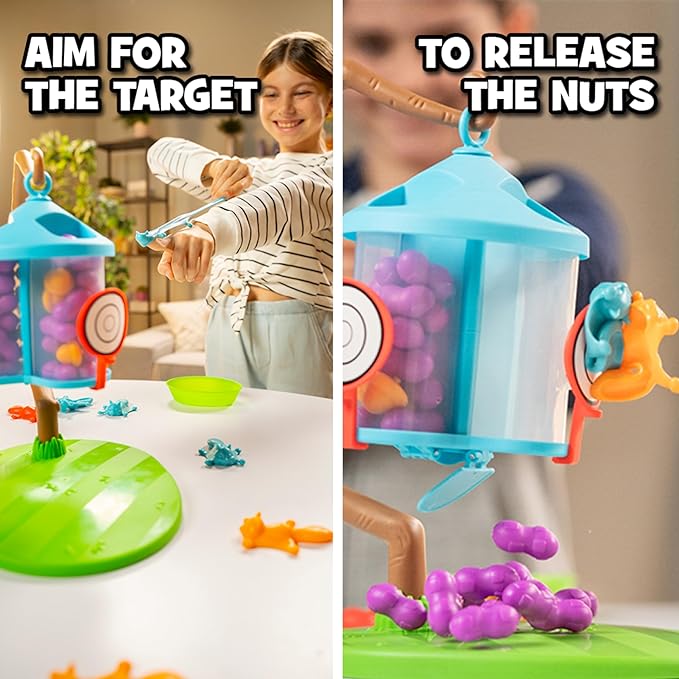 - SKILL AND ACTION PACKED: Race to fling your squirrels at the bird feeder to release the nuts and grab all the peanuts and acorns you can; the player with the most nuts at the end of the game is the winner