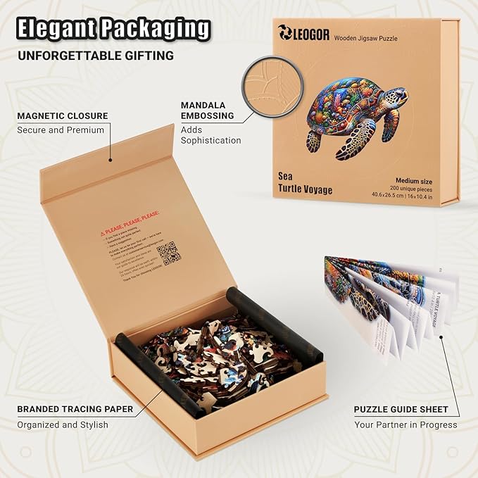 LEOGOR Wooden Jigsaw Puzzles for Adults 200 Pieces (16 × 10.4 in), Sea Turtle Puzzle, Extra-Thick 5mm Wood, Colorful Ocean Mosaic, Unique Gift for Adults and Teens