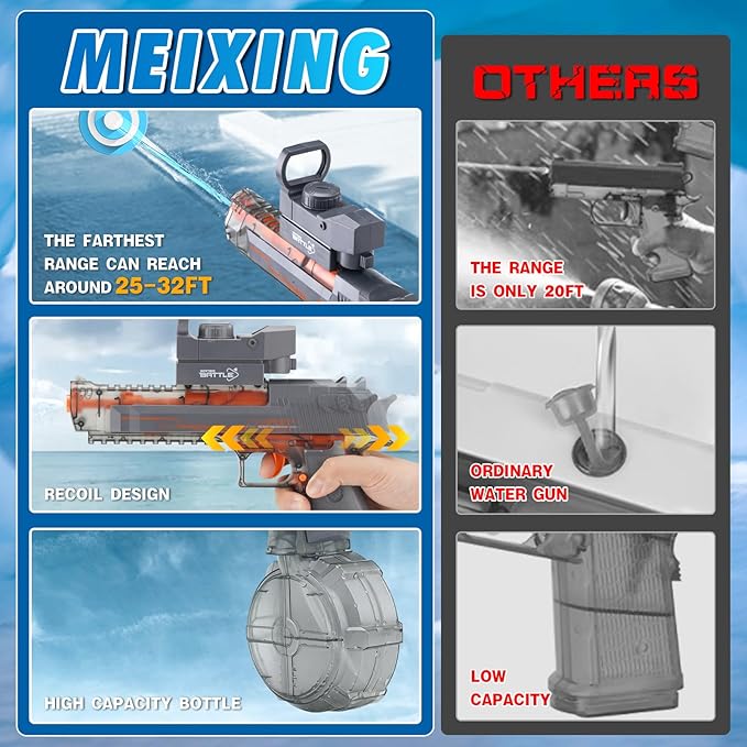 - 【Ideal Gifts for Summer Party Outdoor Fun】Experience endless summer fun with our powerful water guns! Perfect for fadults, teens, and family time at the beach, pool or party, this battery-powered water gun gives hours of entertainment for both kids and adults. It's also the ideal outdoor toys for kids on their special days and carnivals. Give the gift of endless fun with our must-have water gun. - Start enjoying the summer!