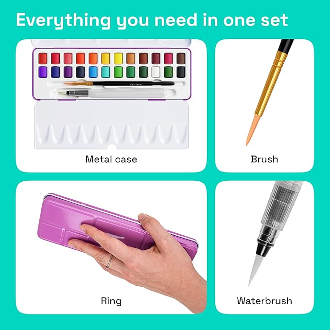 - Everything Included: This portable watercolor set comes with 24 vivid water color paints. The watercolors come with a metal box, a water brush pen, swatch sheet, and flexible brush. Take this kit anywhere!