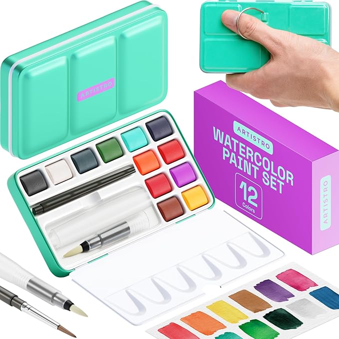 ARTISTRO Watercolor Paint Set in 12 Colors - Travel Watercolor Set with Metal Case & Bright Watercolors - Portable Set for Beginners & Amateur Artists