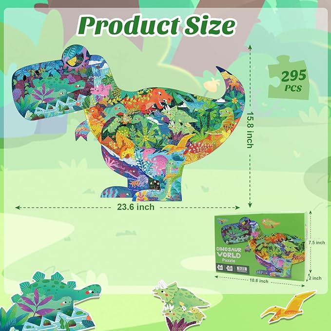 - Dino Fun in Every Piece : This 295-piece puzzles for kids ages 6-8 features a large dinosaur silhouette filled with adorable and brightly colored cartoon dinosaurs. The vibrant artwork captures kids' attention instantly and makes learning about dinosaurs fun and engaging. A delightful alternative to traditional square puzzles!