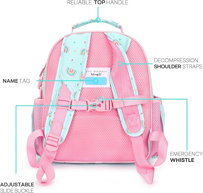 - Surprise design: The toddler girl backpack includes a name tag for personalization, a breathable back panel to prevent sweating, and adjustable shoulder straps to fit a variety of body sizes. The unique whistle design on the chest buckle serves as both a toy and an emergency alarm.