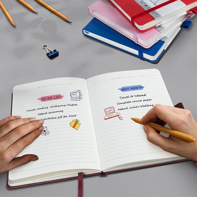 - 【Rainbow Colourful Multipack】 ONAVIA A5 hardcover executive notebooks has 8 colors - Black, Baby Pink, Purple, Red, Claret, Klein Blue, Light Blue, Turquiose. These notebooks for writing fit for note taking, life scheduling, journaling, teaching and studying. Great journal notebook for school, home,office, work, college and travel. Get ready for back to school with our 8 pack of lined journal notebooks, offering ample space for all your note-taking needs