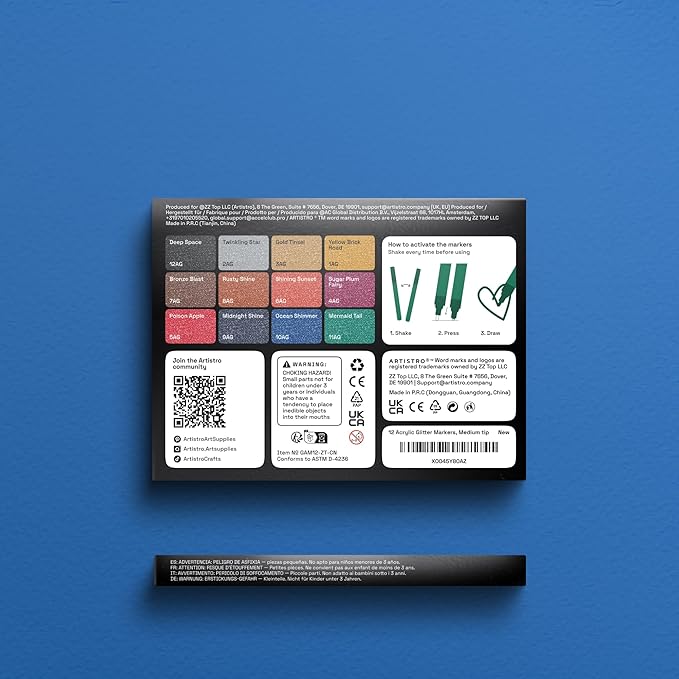 - Non-Toxic: Each glitter marker conforms to ASTM D-4236 standards. This glitter marker set is perfect for pros and beginners. Kids and adults will enjoy these drawing pens glitter. Glitter markers are a great gift for any artist. Great creative with Artistro today!