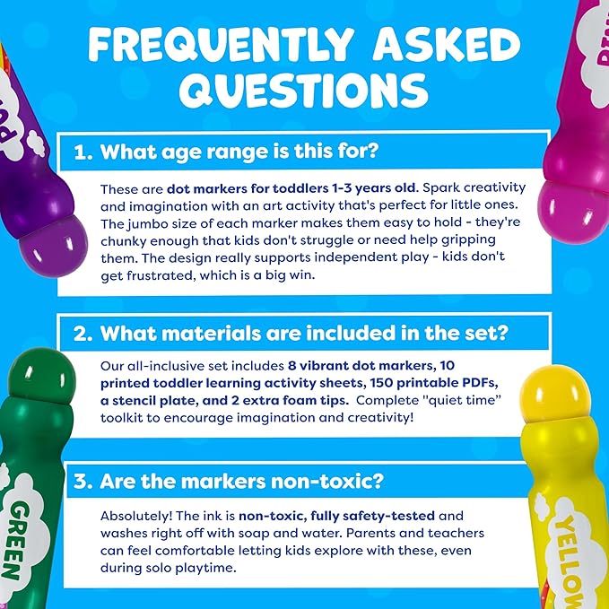 - Endless Mess-Free Fun For Kids With Non-Toxic & Washable Learning Toys For Toddlers. Premium Dot Paints Washable For Kids ensure a safe, clean & stain-free creative experience for little ones. Easy to remove from hands, clothing & surfaces. Have peace of mind while they play and learn for hours. Dot Marker Set are ideal gifts for 3 year old boys & girls & perfect for parents & teachers looking for super fun toddler arts and crafts.