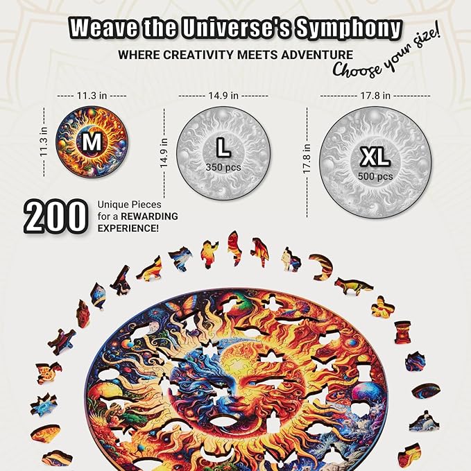 - 【 UNIQUE SHAPES, COSMIC DETAIL 】 Includes 30+ laser cut puzzle piece wood shapes inspired by stars, animals, and nature. Each fits perfectly, forming a colorful mosaic wooden jigsaw puzzle that celebrates the harmony of the sun and moon