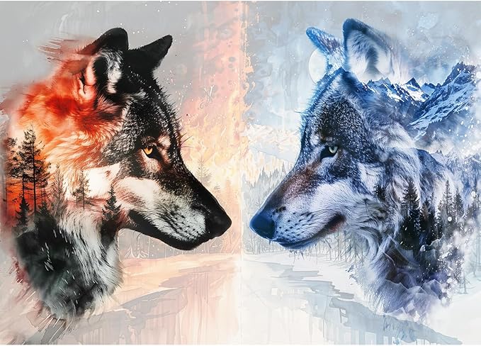 Bgraamiens - Ice VS Fire -1000 Pieces Fantasy Double Exposure Wolf Art, Nature Animals Puzzle Impossible Hard Puzzles for Adults