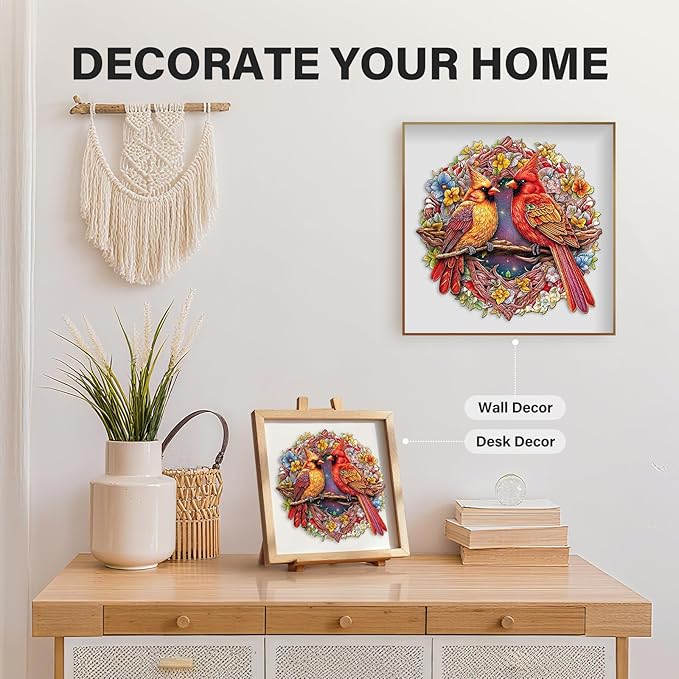 - 【Cardinal Wooden Puzzles】: Two vivid cardinals sit on intertwined branches, embraced by a lush wreath of colorful flowers. Uniquely shaped pieces, delicate petals, or twisted vines, blending nature's vibrancy into an artistic harmony.