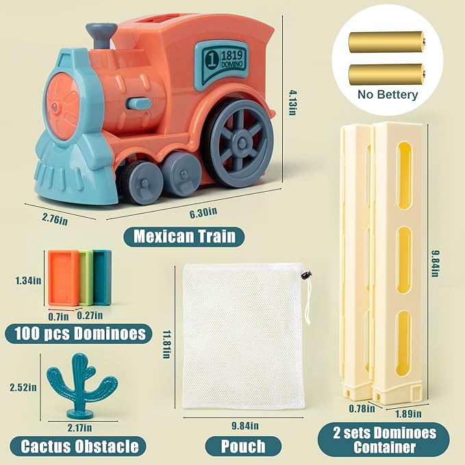 - ❤Automatic Dominoes Train - Opening package you will find the Wonderful Mexican Train, 1 storage bag for Dominoes, 200 pcs of Dominoes, 2 sets of card container, 1 Cactus.