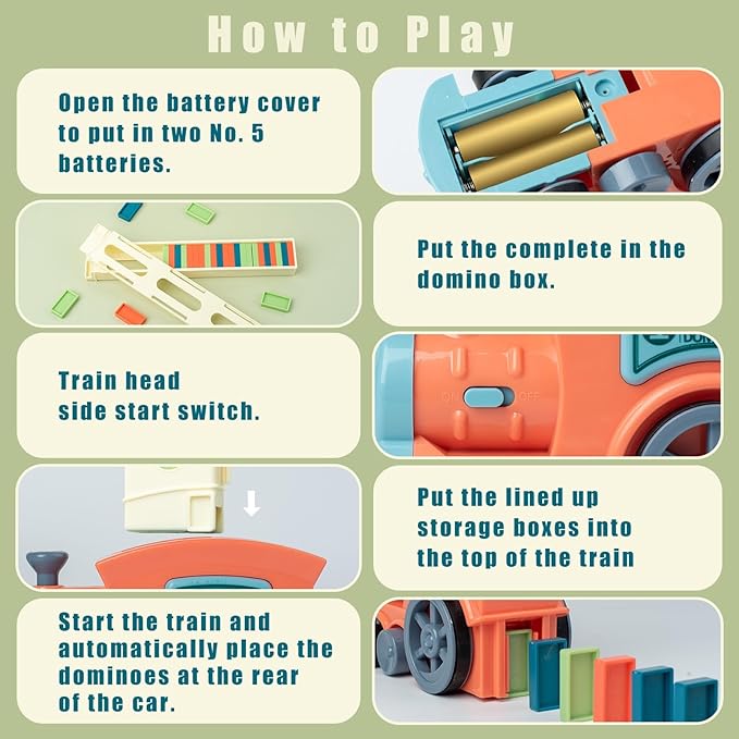 - ❤Easy to Play and Collect - After setting the batteries in the train, it will run automatically and placing the Dominoes from the tail of the train. The smoke stack as the steering wheel of the train you can change the direction of the train to placing different shapes. We are sure that your Children would love to repeat setting the Dominoes in the Container to start the game again!