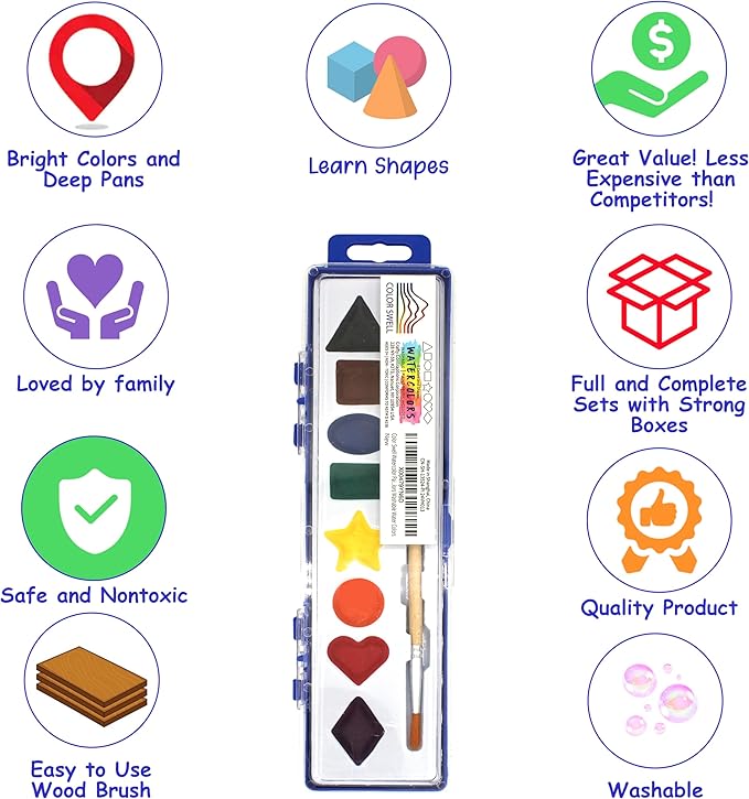Color Swell Bulk Watercolor Paint Set – 18-Pack with 8 Washable Colors & Shape Learning Tools – Includes Strong Wood Brushes for Kids