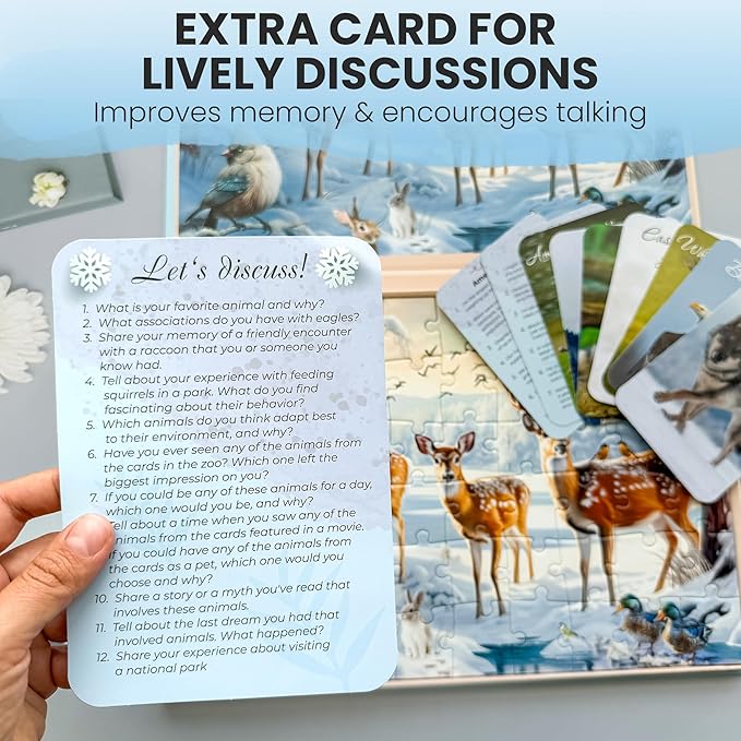 • 9 FLASHCARDS PER PUZZLE: We included 9 realistic cards per puzzle, each featuring 7 facts designed to boost memory and encourage engaging discussions; These cards serve as perfect cognitive games for seniors to dive into memories and exercise them