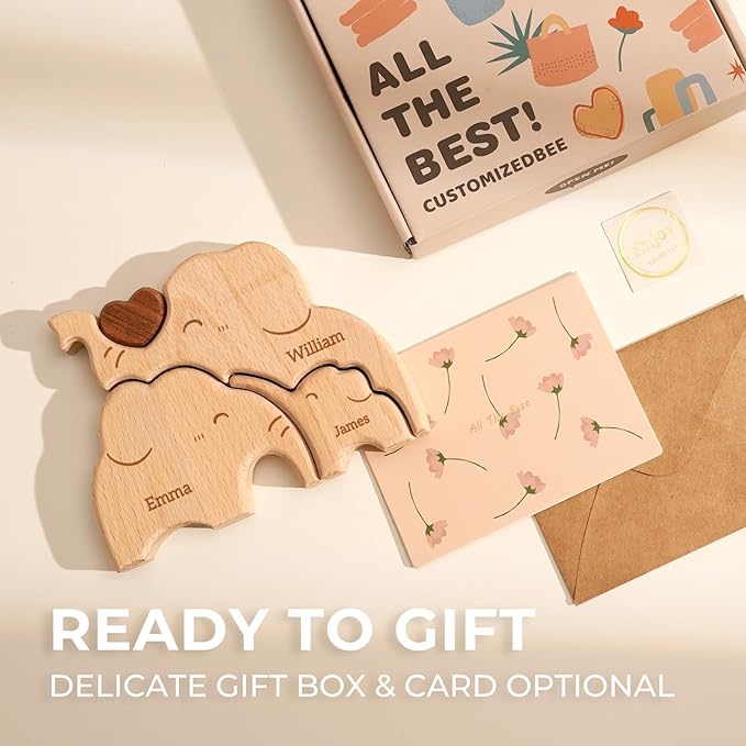 Wooden Elephant Family Puzzle, Personalized Puzzles with 2–5 Names, Father's Day Mother‘s Day Personalized Gifts for Mom Dad Kids Teen Boys Girls Grandma, Toddler Men Birthday