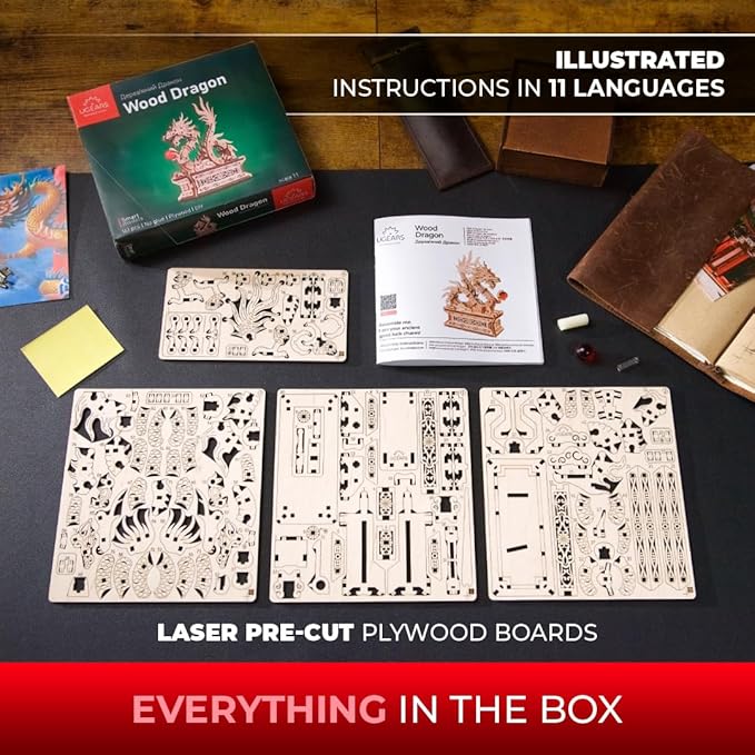- The Ugears wooden crafts for adults Wood Dragon 2024 figurine is a 3D puzzle box and DIY wooden puzzle of a lucky dragon model kit clutching a fiery red pearl in its left claw.