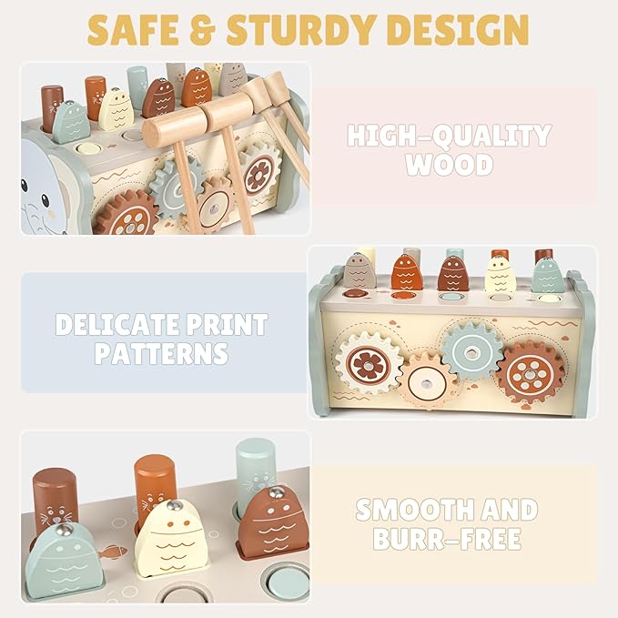 - Multifunctional Toy Set for Endless Fun - This toy features a classic pounding bench, a musical xylophone, a magnetic fishing game, and a gear-spinning activity, designed to spark endless joy and creativity! Watch your child's eyes light up as they tap the wooden pegs, sending the cheerful hamsters bouncing with their adorable smiles. The engaging fishing game and colorful xylophone will also captivate your child's attention, making this a toy they'll love and cherish.