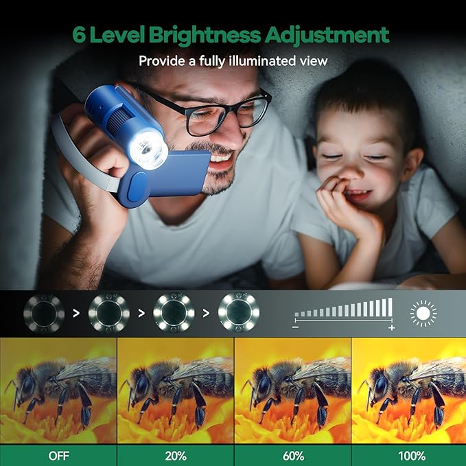 - Full Lighted View: The mini scope for kids has 6 LED lights with 6 adjustable brightness levels, providing bright views in any environment. Whether observing at home, school, or outdoors, it can provide clear and detailed views. Making scientific discovery engaging and accessible
