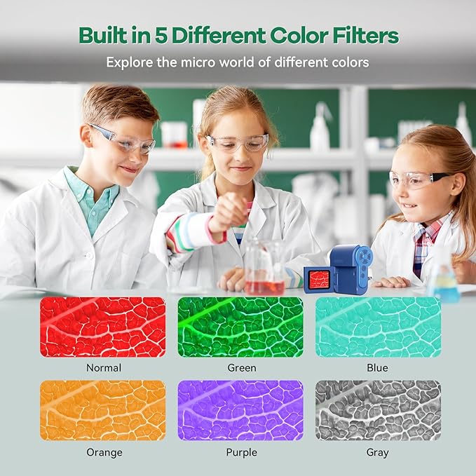 - Explore with Color: Hideal HP20 mini microscope features five colorful filters - green, blue, orange, purple, and gray. Kids can switch filters to highlight details and structures, making their scientific exploration more engaging and educational