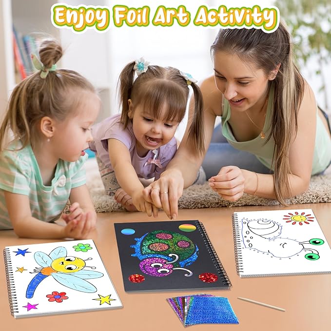 - Foil Art Craft Activity Kits: parents will love this no-mess no glue creative foil activity for kids,it increase hands-on ability and creativity and keeps kids engaged and entertained at home or on the travel, during play date, art classes in the classroom without worrying about any mess.