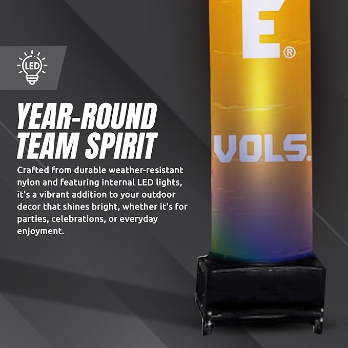 - YEAR-ROUND TEAM SPIRIT: Add a burst of Tennessee Volunteers pride to your home with this unique inflatable. Crafted from durable weather-resistant nylon and featuring internal LED lights, it's a vibrant addition to your outdoor decor that shines bright, whether it's for tailgating, parties, celebrations, or everyday enjoyment.