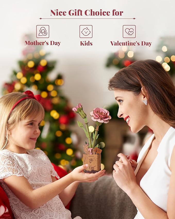 rowood 3D Puzzle Wood Flower,DIY Artifical Flower Building Set Craft Kit for Women,Mother's Day/Valentine's Day/Teacher's Day/Thanksgiving/Christmas/Birthday Gift -Pink Carnation