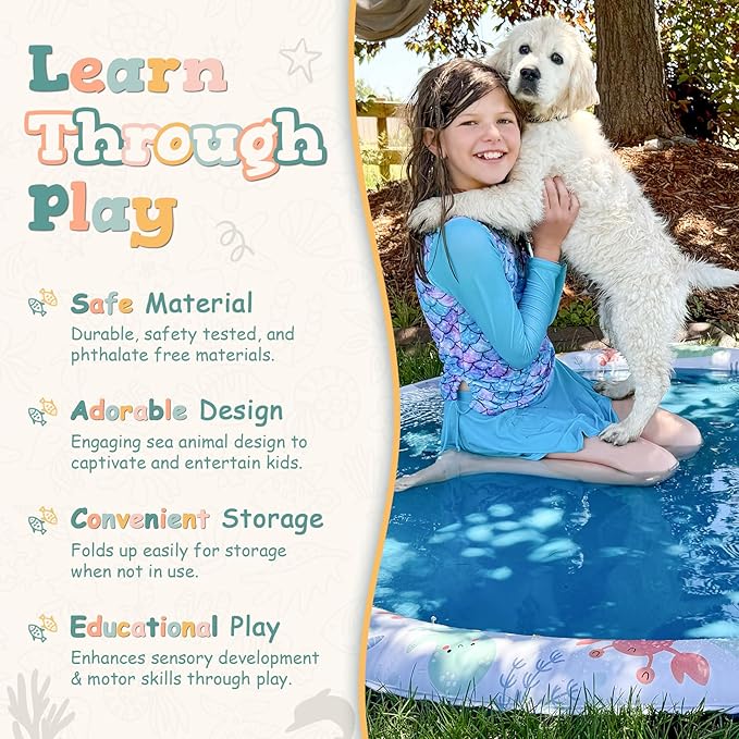 - ππππ¦ ππ’π©π ππ§: With its adorable sea animal design, our splash pad will captivate and engage your little adventurers. Let their imaginations run wild as they splash, jump, and play in the gentle spray of water.