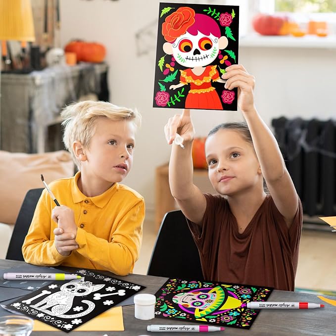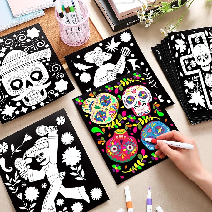Zhanmai Pack of 48 Day of The Dead Sugar Skull Velvet Coloring Posters and Watercolor Pens Dia De Muertos Fuzzy Velvet Coloring Posters for Adults Teenagers Large Poster Arts Crafts