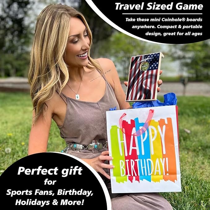 - Compact & Portable Design: Enjoy the classic game of cornhole in a new, miniature, portable cornhole set, official tabletop game size. Includes 2 wooden game boards, 4 Coinhole Coins 2 Gold, 2 Silver, sticker and instructions, in a gift box.