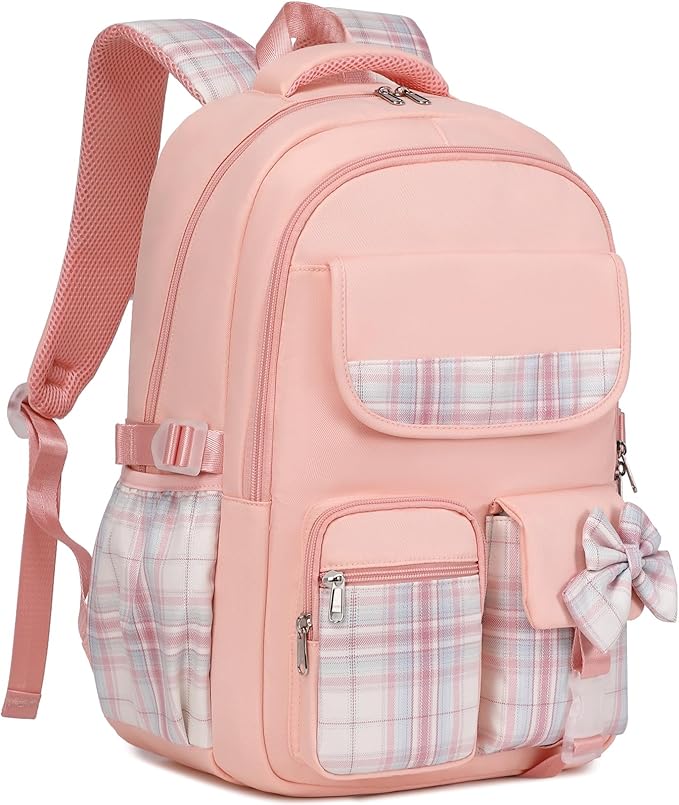 - STYLISH DESIGN DAYPACK - It's a pretty design in the popular style in pastel colours with bow and plaid decoration. There are lots of pockets can keep things organised and find them easily. There are four pockets on the outside of the bag; one of which is velcro closing, one has a clip, the other two have zippers.
