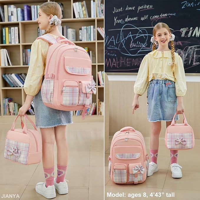 JIANYA Girls Backpack With Lunch Box for Elementary School, Bow/Pink