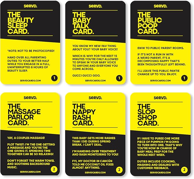 - The Ultimate Gift For Newborn Parents – SERVD Newborn Parents gamifies everything you could possibly think of when it comes to being a sleep deprived, exhausted and sometimes overwhelmed new parent. The perfect postpartum gift, maternity gift, or 1st birthday gift idea for new moms and dads who deserve more than another set of bibs. Ideal for baby showers, gender reveal parties, or as a must-have newborn essential that brings laughter to the household.