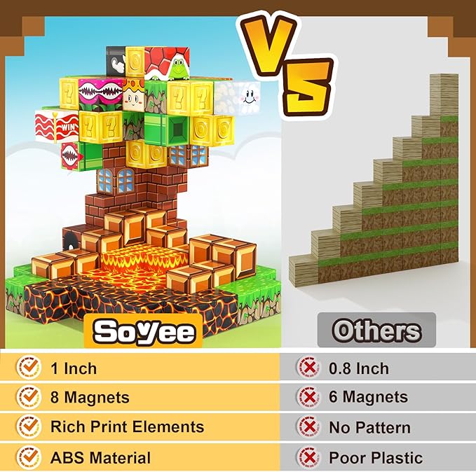 - QUALITY YOU CAN TRUST – SOYEE toys pay more attention to the quality and playability of toys, safe edges, UV printing, and suitable magnitude of the magnetism. The kids toy is more than just a building set - it offers kids a chance to create entire game worlds! They promote creativity and visual learning and help kids gain a big sense of color, art, geometry, and structure