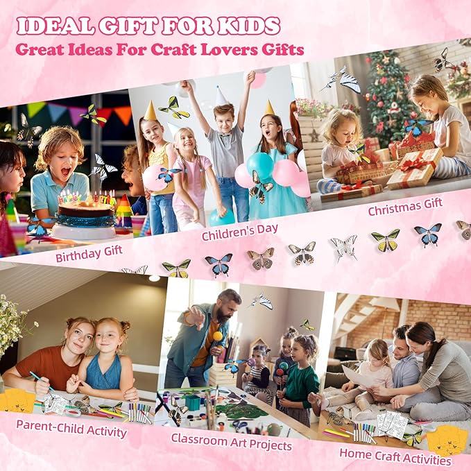 - 【DIY Butterfly Craft Kit for Children】: This is a very comprehensive DIY craft kit, including 5 different styles of butterflies, 3 butterfly stands, 16 Flying Butterfly Toy, 12 colored pens, 3 blank butterfly cards, double-sided tape, an instruction card, and a gift box. You can unleash your DIY creativity! Engaging in DIY activities with children is a great parent-child bonding activity that enhances relationships. It provides painting colors, enhances creativity, attention, and imagination, and develops hand-eye coordination and color perception