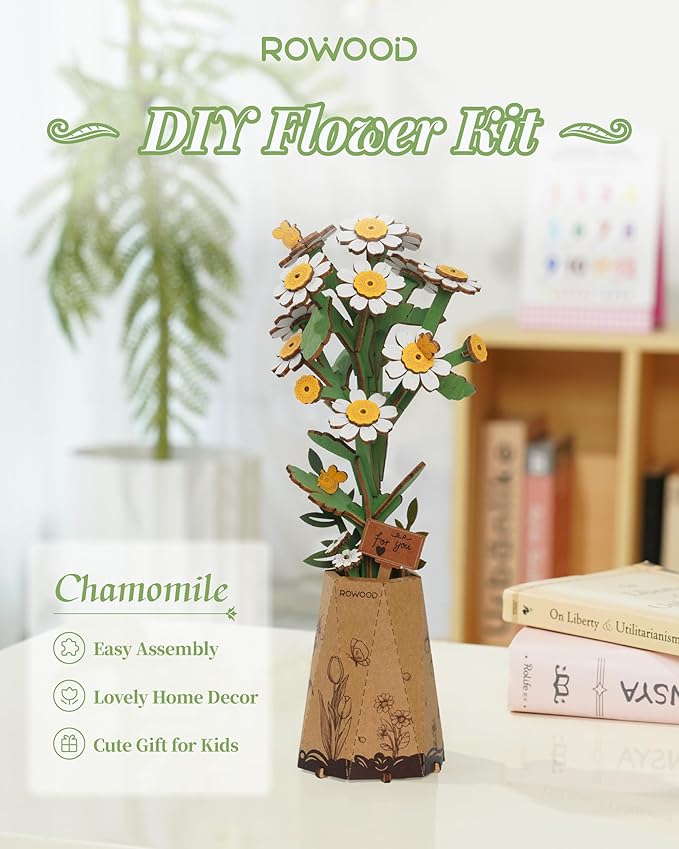 rowood 3D Puzzle Wooden Flower,DIY Flower Building Block Set Craft Kit for Kids,Mother's Day/Valentine's Day/Teacher's Day/Thanksgiving/Christmas/Birthday Gift for Mom/Grandma-Chamomile