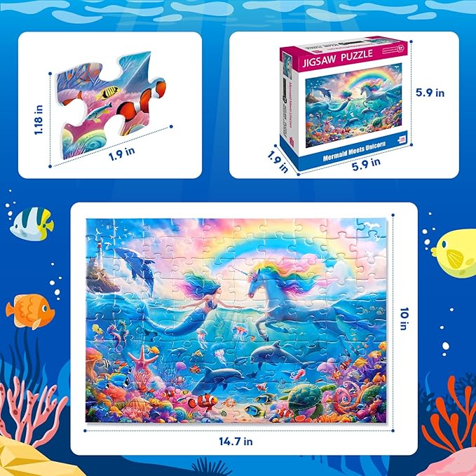 - 【Great Gift for Kids】This 100 piece puzzles for kids ages 6-8 8-10 must be an ideal gift choice for birthday, thanks giving day, Christmas. The mermaid unicorn puzzle for girls 4-6. When the beautiful mermaid meets the mythical unicorn, something magical happens. The deep blue sea floor, with various marine creatures, is such a beautiful scene!