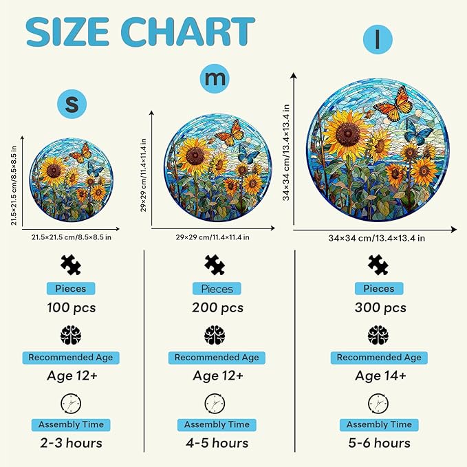 - 【Sunflower wooden puzzles】The sunflower with butterfly wooden jigsaw puzzle has a special meaning, and each one is unique and meticulously crafted. It can provide you with hours of fun and entertainment, putting together this special puzzle, and everyone can enjoy the fun of completing it.