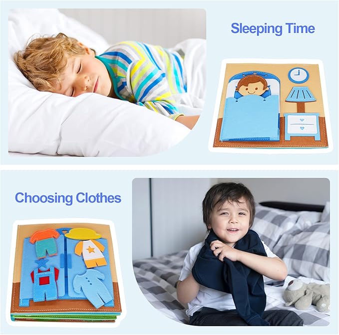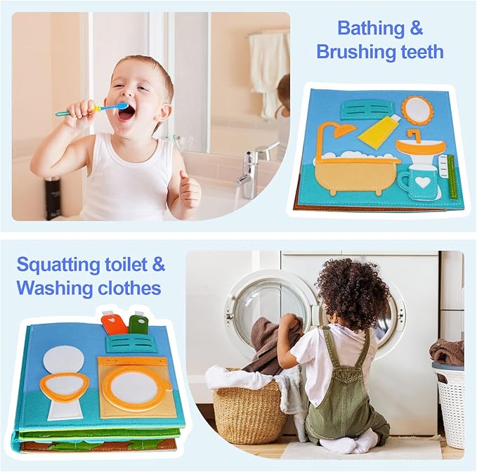 - Montessori Busy Board: This handmade BizyKoady busy book comes with pictures and simulated house games, which brings fun to a child's life, 3D felt activity book brings children into the action through everyday stories and thus stimulate the development of visual and tactile senses. It's an entertaining and educational way for children to learn about everyday life.