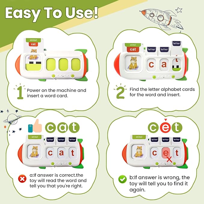 - Alphabet Word Spell-Check Fun Learning: lit letters flash cards,interactive spelling toy game,kids can spell words by touching letters on the cards and get immediate feedback on their spelling through fun sounds,spell alphabet flash cards,lights and vibrations to make learning spelling interactive and memorable.