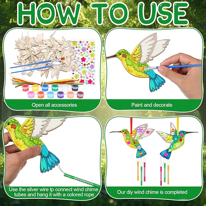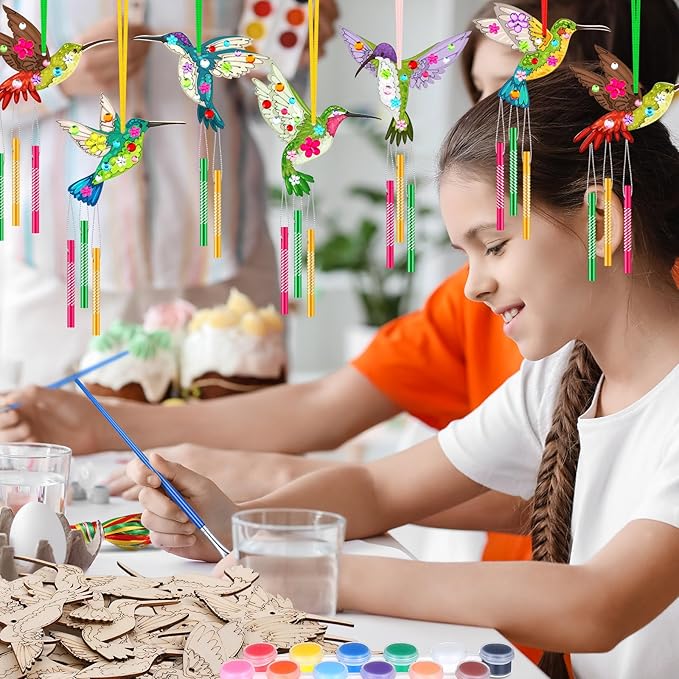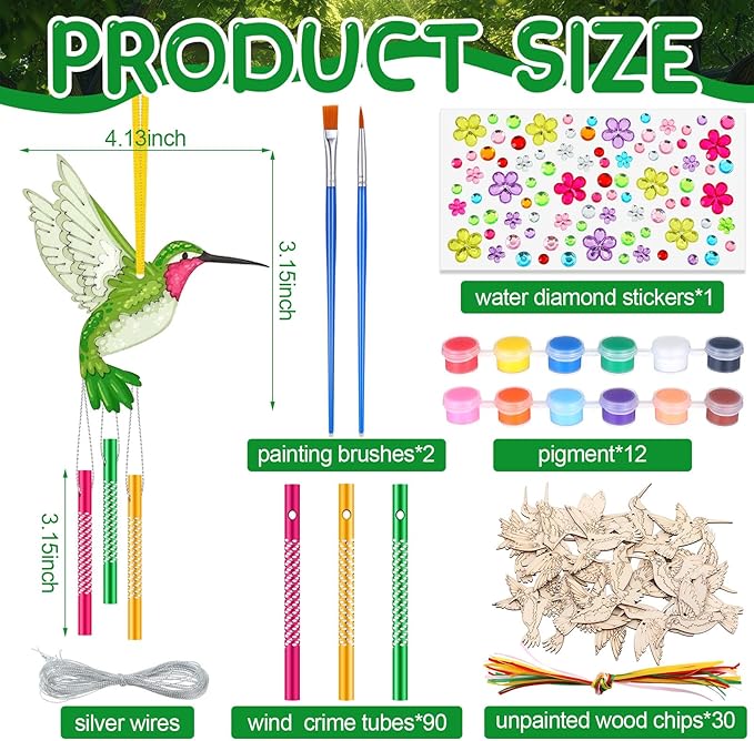 - What You Get: 30 pieces hummingbird wooden wind chimes have 6 different shapes and sizes, 5 pieces in each style, 90 pieces wind chime tubes available, comes with silk thread, stickers and paint; Abundant quantity is enough to meet the needs of children's various activities, so that kids can create their own wind chimes wooden crafts, improve kids' creativity