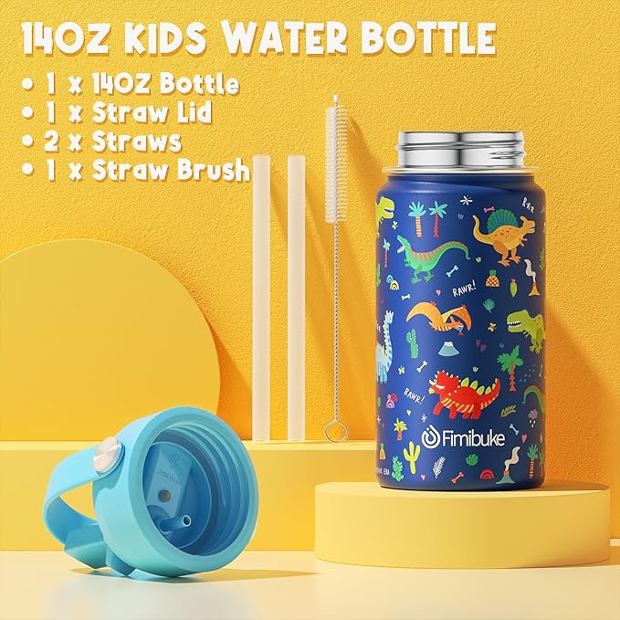 - 14OZ KIDS INSULATED WATER BOTTLE: With double-walled vacuum insulation, these toddler water bottle can preserve beverage temperature up to 24 hours for cold and 12 hours for hot. The seal zone technology in the lids guarantees that each insulated water bottle is 100% leak-proof and spill-proof. Fimibuke sweat-free kids water bottle features a sturdy wide rotating handle, allowing to carry kids drinks around to keep them hydrated without making messes. All designed to keep kids beverage fresh